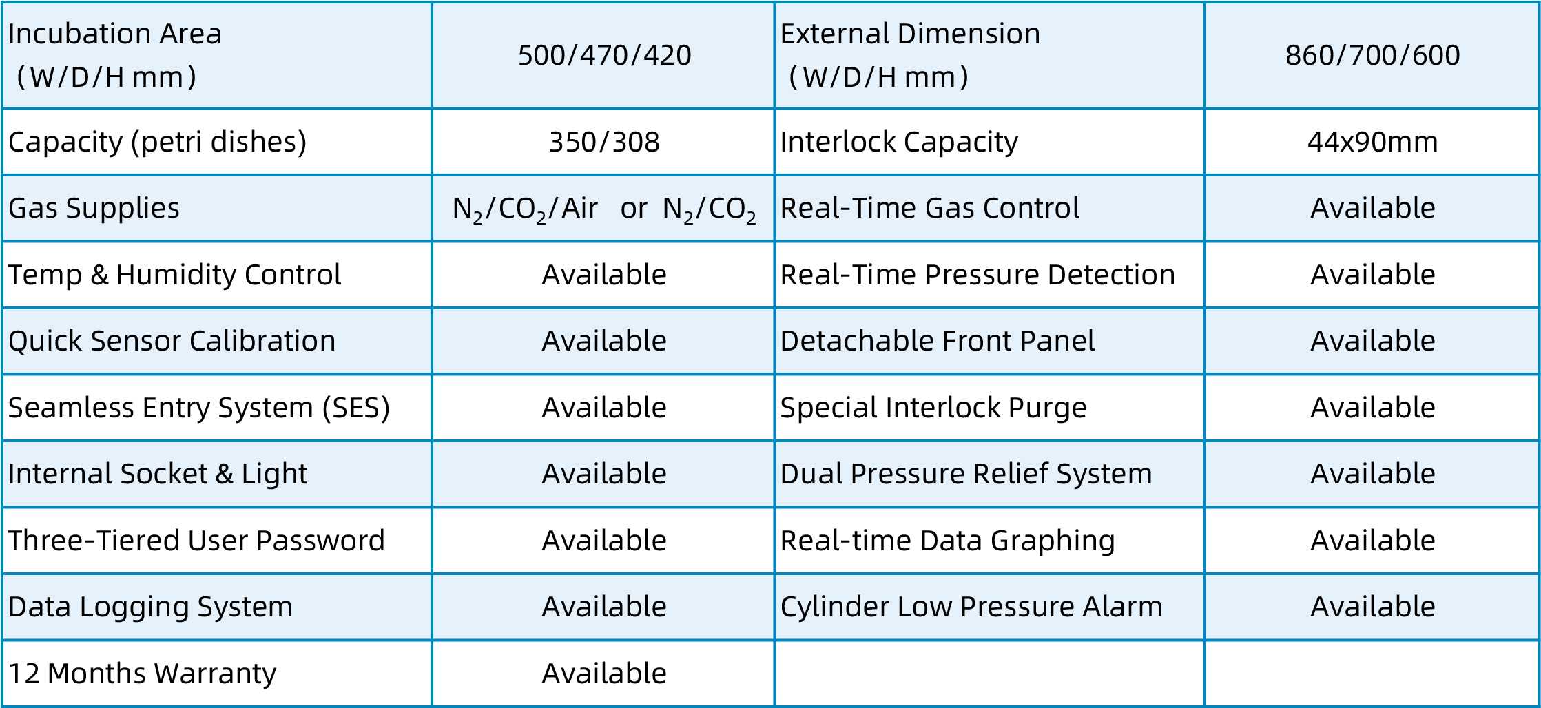 • O₂ Control Range: 0.1%–25.0%, in 0.1% increments